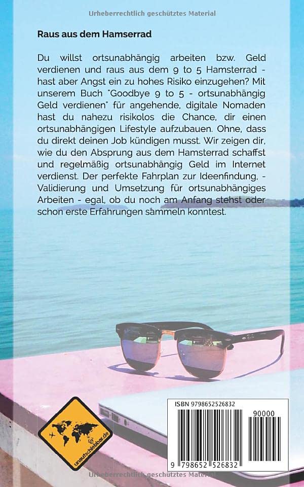 Neuste und überarbeitete Auflage.Du willst ortsunabhängig arbeiten bzw. Geld verdienen und raus aus dem 9 to 5 Hamsterrad – hast aber Angst ein zu hohes Risiko einzugehen? Mit unserem Buch „Goodbye 9 to 5 – ortsunabhängig Geld verdienen“ für angehende, digitale Nomaden hast du nahezu risikolos die Chance, dir einen ortsunabhängigen Lifestyle aufzubauen. Ohne, dass du direkt deinen Job kündigen musst. Wir zeigen dir, wie du den Absprung aus dem Hamsterrad schaffst und regelmäßig ortsunabhängig Geld im Internet verdienst. Der perfekte Fahrplan zur Ideenfindung, -Validierung und Umsetzung für ortsunabhängiges Arbeiten – egal, ob du noch am Anfang stehst oder schon erste Erfahrungen sammeln konntest.Für alle, die mehr von der Welt sehen wollen, aber trotzdem ein regelmäßiges Einkommen erwirtschaften möchtenSowohl wenn du angestellt bleiben möchtest als auch wenn du dein eigenes Online Business aufbauen willstEs spielt keine Rolle, ob du Vorkenntnisse zum ortsunabhängigen Arbeiten hast oder bei Null startestDer perfekte Schritt für Schritt Fahrplan zur Ideenfindung, -Validierung & UmsetzungSchaffe den Absprung aus dem Hamsterrad noch in diesem Jahr, wenn du Gas gibstVerdiene regelmäßig und ortsunabhängig Geld im InternetUm ein selbstbestimmteres Leben zu führen, mehr Freiheit zu erlangen und dein eigener Chef zu werdenIn 8 Kapiteln erhältst du auf über 250 Seiten praktische Tipps und konkrete Handlungsschritte um als digitaler Nomade ortsunabhängig arbeiten zu können. Starte jetzt durch. Dein digitaler Ausstieg ist theoretisch noch in diesem Jahr möglich. Wir zeigen dir wie es geht. Beachte auch unser Aufbaubuch „Goodbye 9 to 5 – ortsunabhängig arbeiten & leben“.