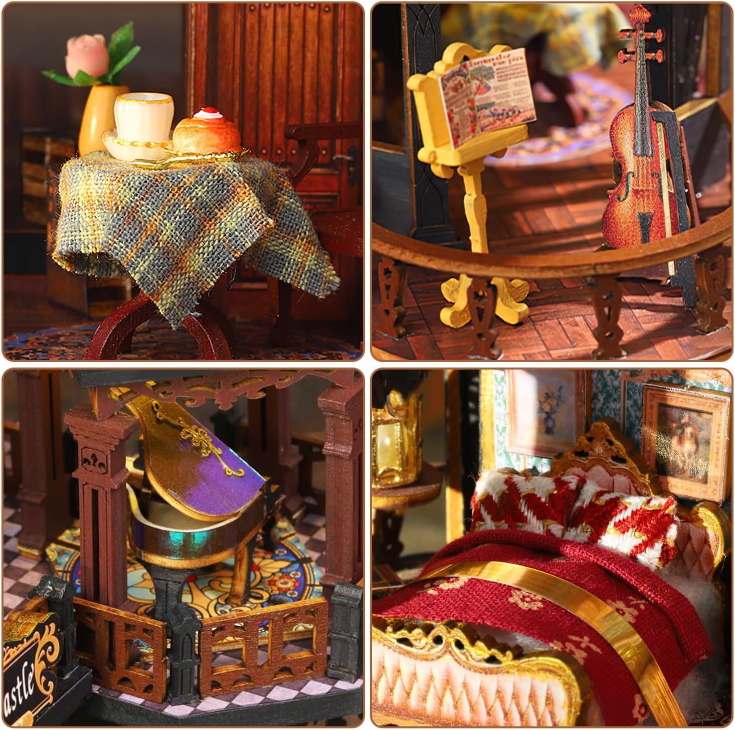 Custom-made: DIY Edinburgh Castle style dollhouse with interior design and super bright LED lights. This is a Edinburgh Castle style cottage with a beautiful patio under the stars, an owl, a coffee table, a guest table, a snack table, a piano room, a bed, a bath and much more. Let’s explore the world of Edinburgh Castle together.