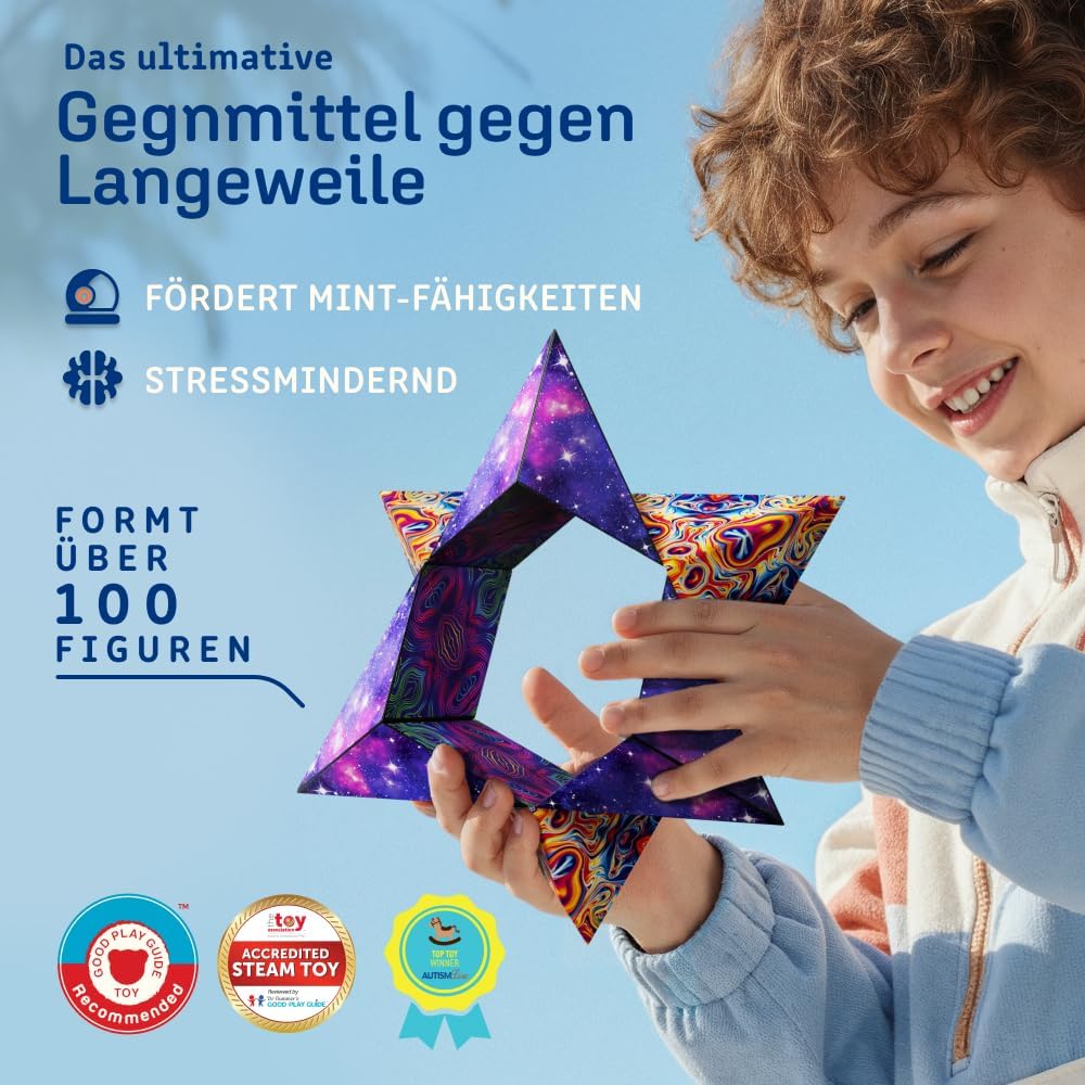 Nothing is comparable to the quality and unique design of the Shashibo anti-stress toy magnetic game dice. This puzzle building cube is made of cast premium plastic, contains 36 rare earth magnets and has a robust, matte or high-gloss surface. Each magnetic puzzle box stress cube has 4 unique, artistic patterns with fascinating designs, with which you can create infinite many beautiful combinations.