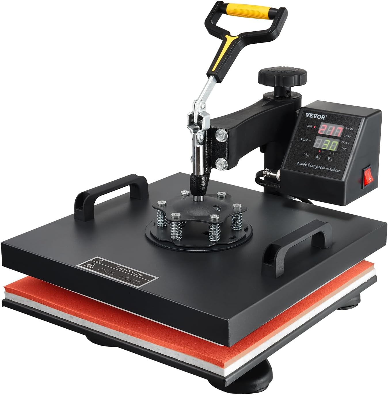 DIGITAL CONTROL SYSTEM This heat press is equipped with a precise control panel, which helps you accurately regulate the temperature and time. After finishing the heating process, an alarm will automatically sound to remind you to take out the items. Temperature range: 32-430°F / 0-250°C; Time control: 0-999 seconds; Power: 1500W; Voltage: 220V
